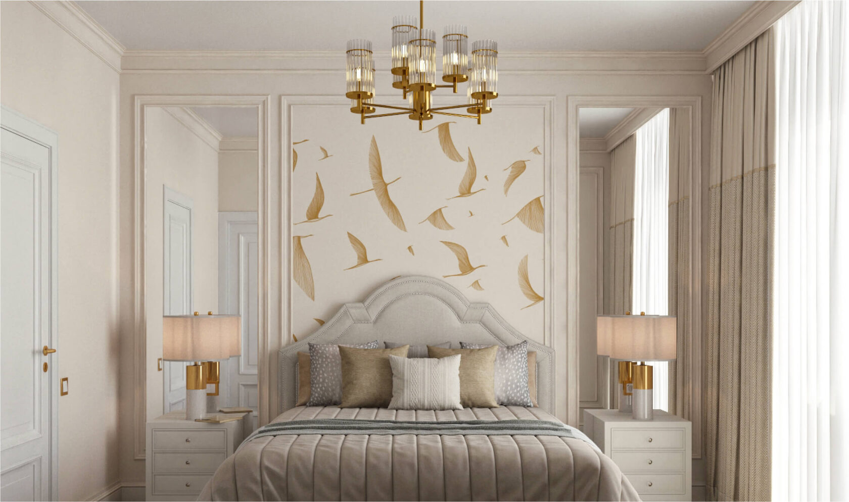 За изголовьем кровати в рамках лепнины использованы зеркала и фреска. Данная композиция расширяет пространство и придает ему особую роскошь, которую так же подчеркивает остальная лепнина, мебель и элементы освещения.
