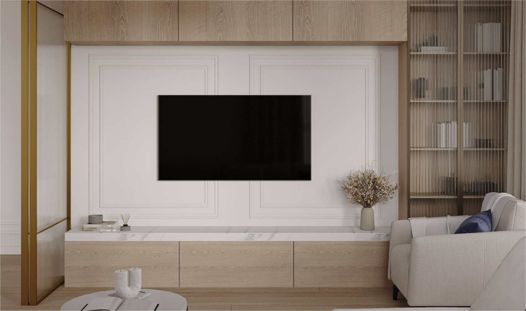 Ключевые элементы дизайна — композиции из лепнины и латунные элементы. Лаконичная форма зеркала перекликается с люстрой и придает ощущение легкой атмосферы.